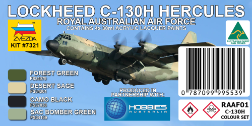 Colour Set to suit the RAAF Camouflage scheme. This set contains 4 colours, 3 colours from our Premium range (Forest Green, Desert Sage and Camo Black) along with the all new and exclusive to this set SAC Bomber Green, which will give the customer all the correct colours to paint the new kit in the RAAF scheme.