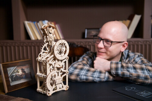 The DIY wooden Engine Clock is the latest addition to the Ugears collection of working clocks, including the Aero Clock wall clock with pendulum, and the Sky Watcher Tourbillon Table Clock. While those models are both "Advanced" level, with the Engine Clock we strove to design a functional clock at the "Medium" difficulty level, so that more hobbyists could experience the satisfaction of building their own functional DIY 3D model clock. As with all Ugears models, the Engine Clock is assembled without glue or special tools—just remove the laser pre-cut pieces from their art-quality composite wood boards and snap them together. Each kit comes with detailed, step-by-step, full-colour illustrated instructions to guide your assembly, and sandpaper and wax to smooth and lubricate all moving parts for optimal function. If you get stuck during the assembly, need help troubleshooting, or break a piece during construction, just email our outstanding customer service team—we'll be glad to answer any questions or send replacement parts free of charge!